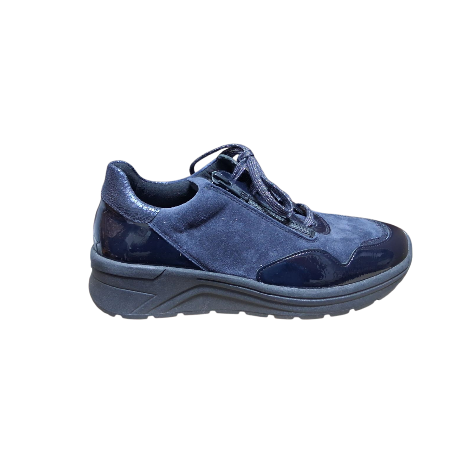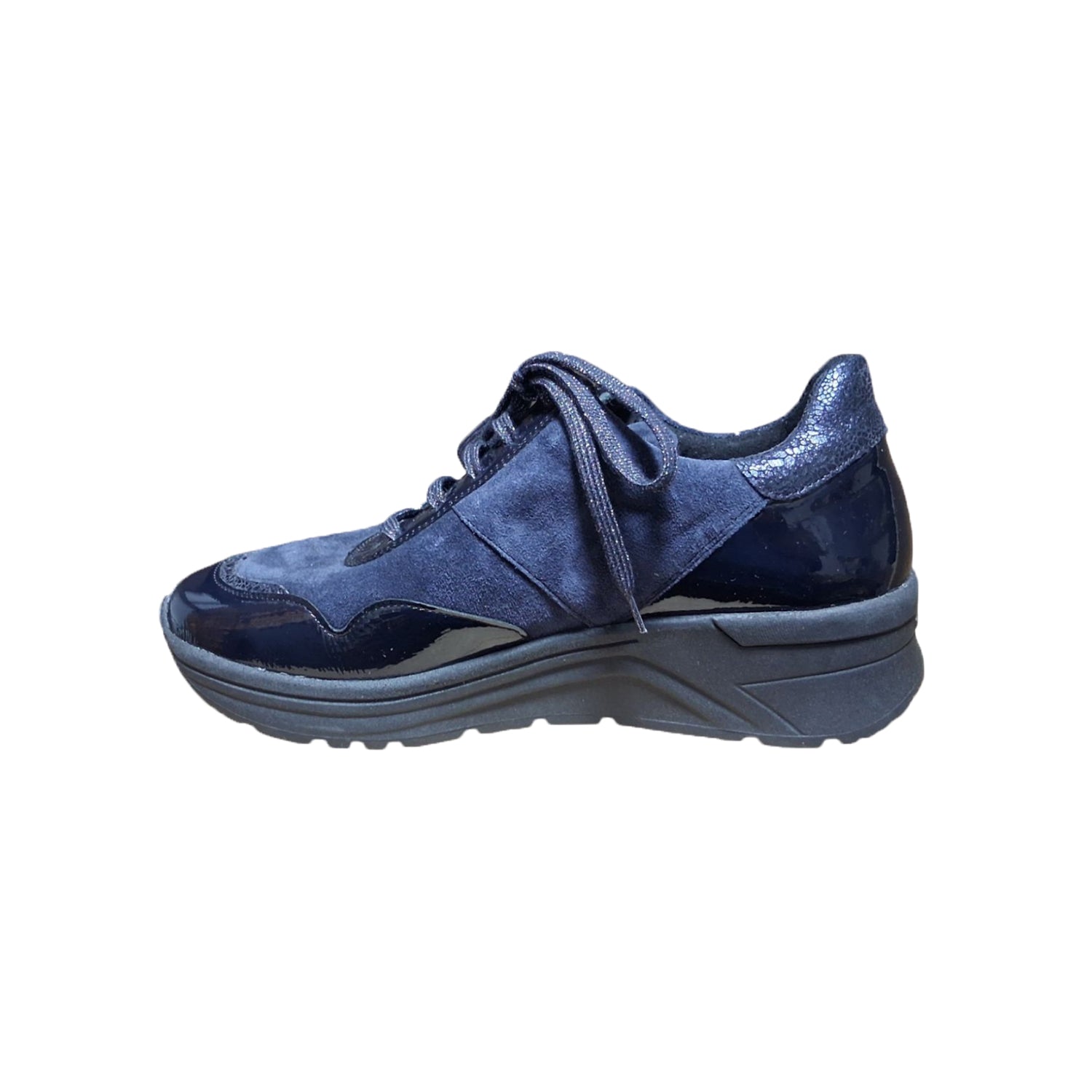 The new sneaker group KARMA (width K) impresses with its slightly higher, two-tone wedge sole (45 mm) made of slip-resistant TPS/TR light. In addition to a beautiful gait pattern and sporty style, Karma guarantees the perfect balance between stability and running dynamics thanks to the raised heel and toe. Crash-patent , gold-coloured eyelets, lurex laces and subtle metallic details add a touch of glamour to sneakers and sneaker boots. Indispensable for trendsetters: lightly padded materials with cassette stitching, available in a matt or high-gloss look depending on taste.