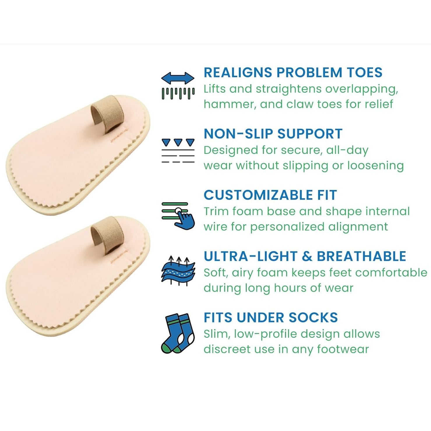 Corrective Toe Alignment – Helps straighten and realign hammer toes, claw toes, and overlapping toes while easing pain at the tops and tips.